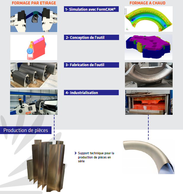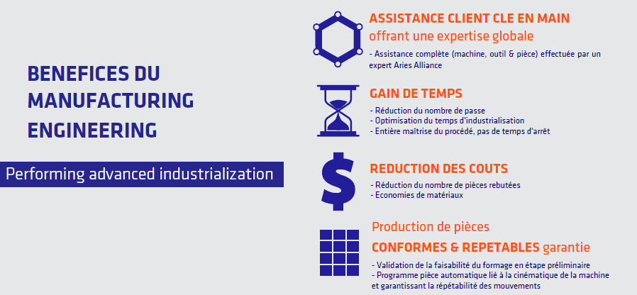 Issue de l'expérience et des savoirs-faire d'Aries Alliance, cette solution offre une assistance totale, de la simulation a à la production. Le manufacturing engineering est adapté aux technologies de formage à froid et à chaud et se décompose en 4 étapes distinctes :